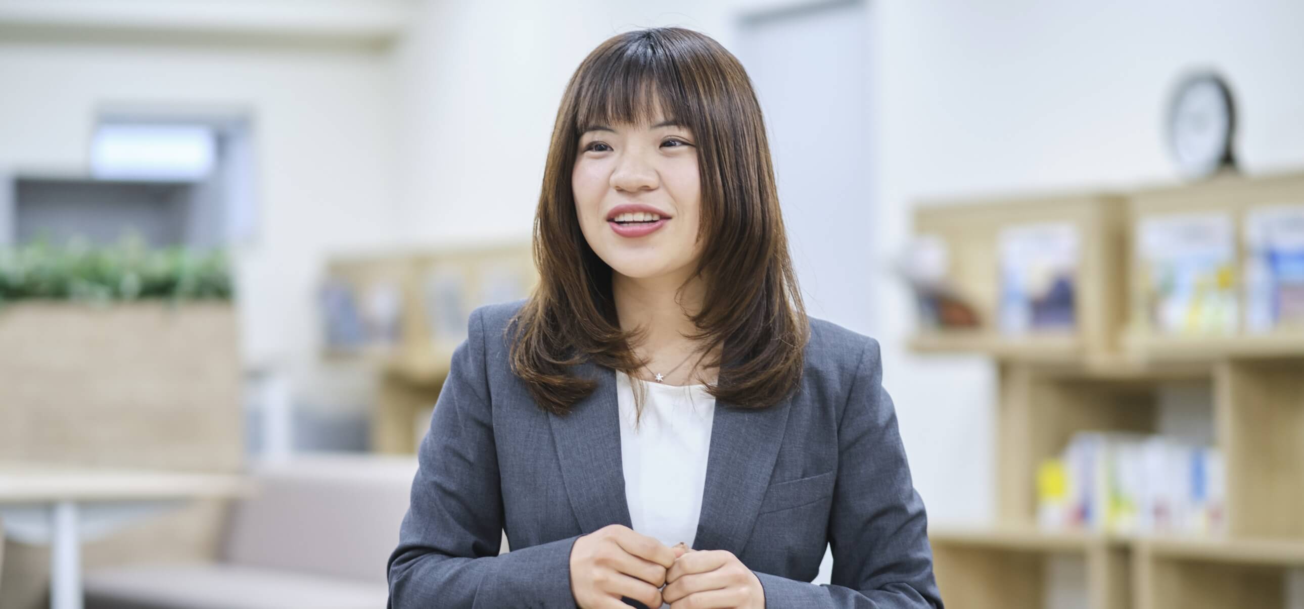 - 学生時代は衣食住に関することについて学んでいました。事務職として約5年間働いた後、5年目に総合職へ職種転換し、今は新卒・中途採用や新入社員育成の仕事を行っています。